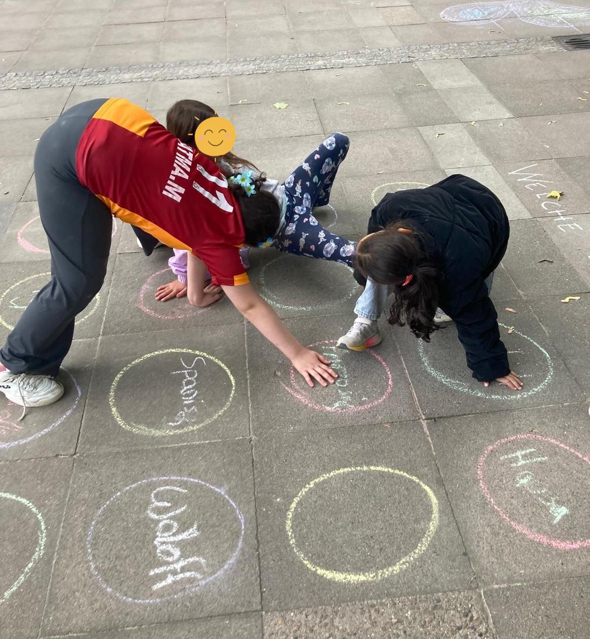 - An einer weiteren Station brachten sie ihre Gefühle kreativ zum Ausdruck und gestalteten den Boden mit farbenfrohen Zeichnungen.
