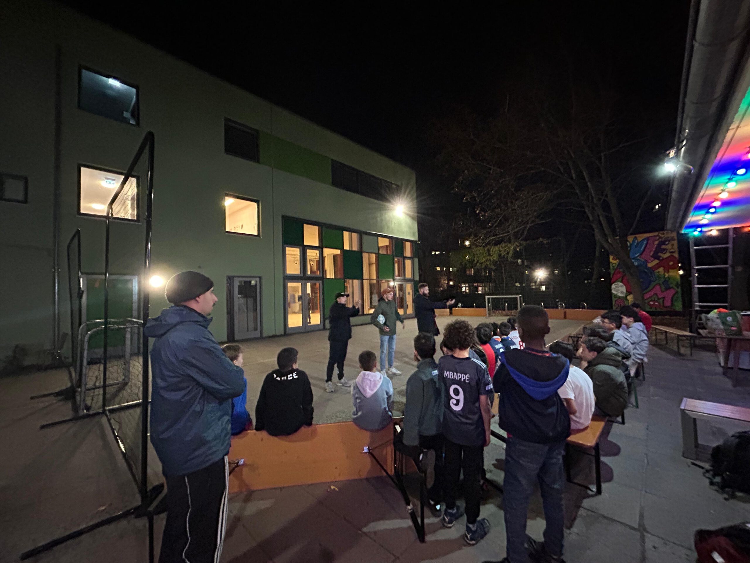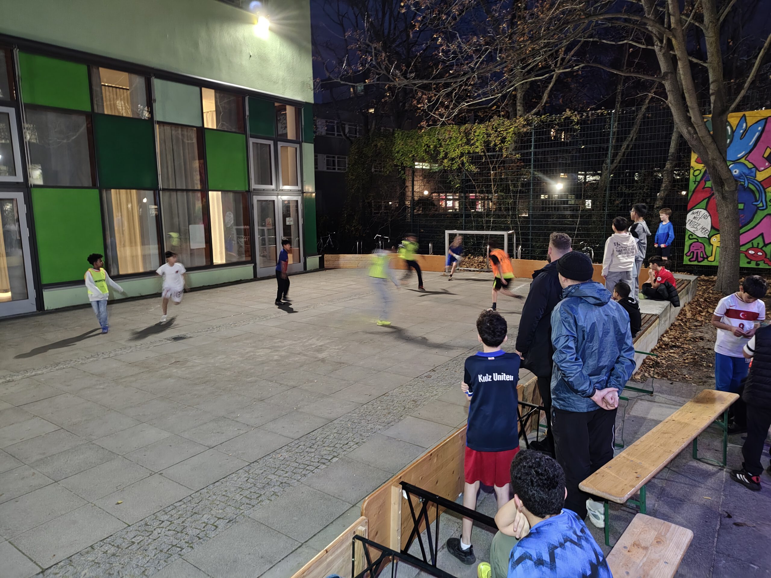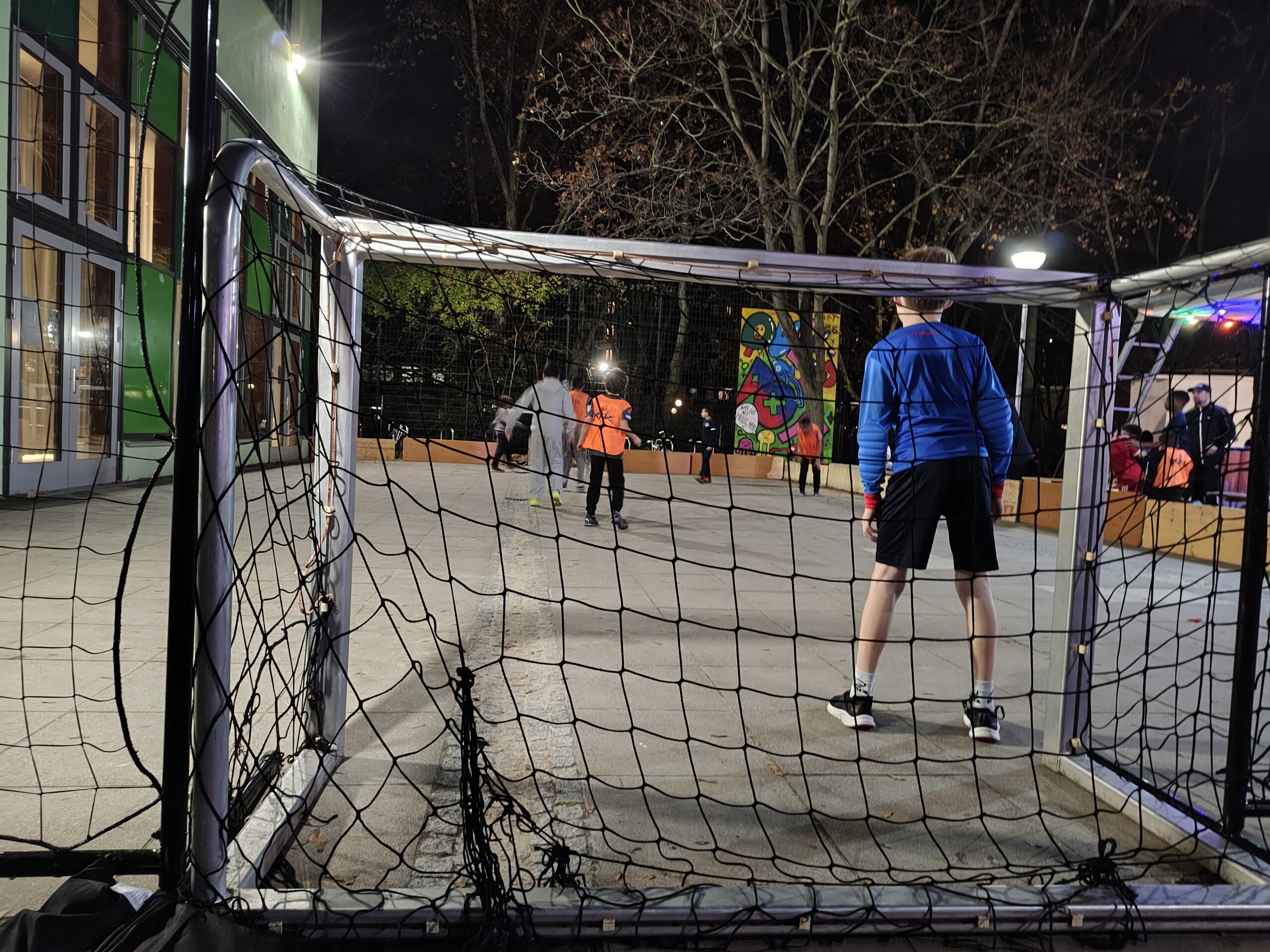 Was sonst in der Turnhalle stattfindet, wurde diesmal zu einem echten Street-Fußball-Highlight: Der KIDZ Street Cup wurde auf dem Außengelände der Villa Lützow ausgetragen. Die Freifläche vor dem Haus verwandelte sich für einen herbstlichen Spätnachmittag in eine kleine, aber eindrucksvolle Fußballarena. Mit einer rundum verlaufenden Bande und hellen Baustrahlern, die als Flutlichtmasten dienten, entstand eine Atmosphäre wie bei FIFA Street.