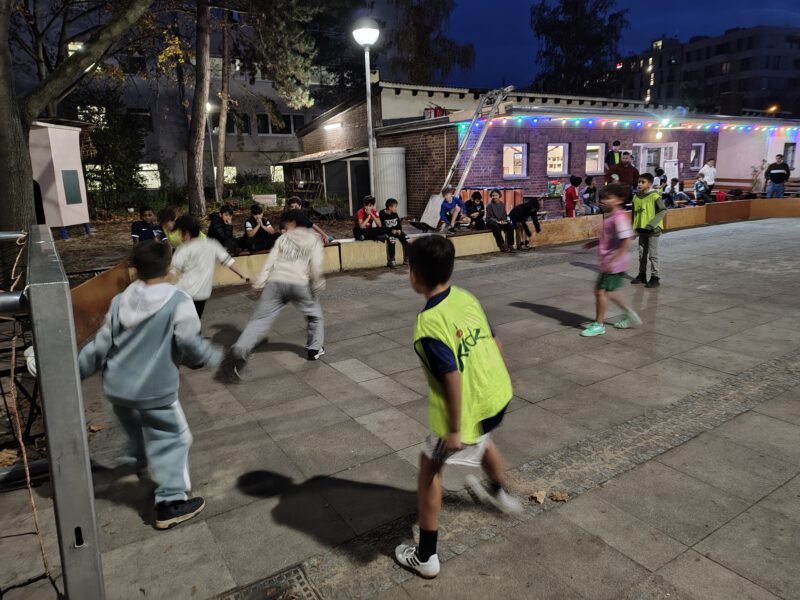 Auf unserem Außengelände gibt es eine tolle Neuerung: Ein großes, mobiles Ballfangnetz trennt nun (bei Bedarf) die Fußball-Fläche von der Freispielfläche und dem Spielplatz. Eingeweiht wurde es an einem lebendigen Dienstagnachmittag mit den Kids aus der sozialen Gruppenarbeit, einigen Kindern des Kindertreffs und den Familien aus dem Familienzentrum. So